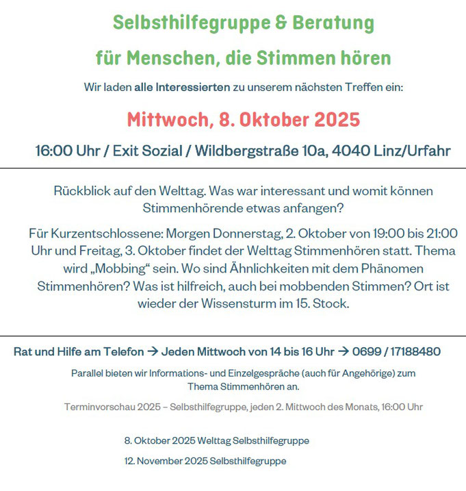 Wir treffen uns weiterhin monatlich in einer Selbsthilfegruppe und in der Teerunde, beraten telefonisch, per Email und vor Ort und wir haben weiterhin wie nun seit beinahe 25 Jahren ein offenes Ohr für die Sorgen, Probleme und Anregungen Stimmenhörender, ihrer Angehörigen und FreundInnen.